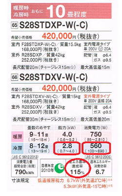 今回は、ダイキンさんのルームエアコンの性能表で見てみたいと思います。ゼロエネルギー住宅にするための要素のひとつ、高効率なルームエアコンとは、「エネルギー消費効率が、建築研究所がホームページで公開する冷房効率(い)を満たすもの又は省エネ基準達成率121%以上(統一省エネラベル5つ星以上)」とあります。上の表で、省エネ基準達成率は、115%ということで、このエアコンでは、NGとなります。ただ、冷房の方を見てみると、能力は2.8kW=2800W、消費電力は560W、エネルギー消費効率(COP)を計算すると5.0で、この場合、建築研究所の冷房効率(い)を満たすことになります。ちょっと計算が面倒ですが、その手間をかけると価格の安いものが選べるということかもしれません。