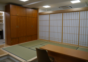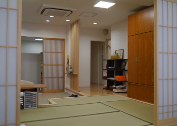 打合せを重ね、呉服をメインに店舗づくりを進めることになりました。日本の伝統・文化である着物なのですが、いろいろお話をしていると知らないことばかり。打合せを通じて本当に勉強になりました。お店では、展示会、着付教室、茶道教室など大小さまざまなイベントに対応できるよう可変性をもたせることになりました。あくまでも商品が主役で、店舗は舞台装置。色合いも主役の商品を引き立たせるようにあまり主張しない、自然素材のものを多用しました。プランに関しては、昔の民家のプランを参考にしました。昔の民家、田の字プランといって、田の字型に畳が配置されていて、それぞれの部屋を建具で仕切っています。祭事や集まりごとなどがあると、建具を移動して仕切り直し使っていたといいます。今回の店舗でも建具を開けたり閉めたり、または、どちらかへ移動することで、さまざまなイベントに対応する仕掛けをほどこしました。