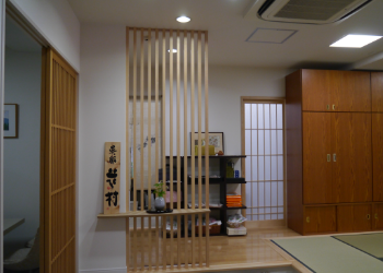 格子の奥は、事務所スペースです。お客様が来られた時に、すぐわかるように暖簾にて仕切ることになりました。