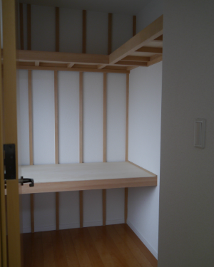 たっぷりの収納を設置しました。中段、枕棚の壁側には、湿気がこもらないように、壁との間に隙間を設けました。そうすることで空気を循環させようとしています。