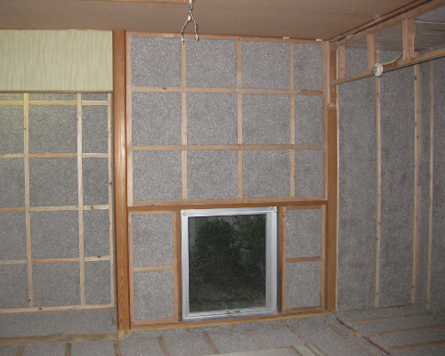 断熱材はセルローズファイバー吹付を採用しました。また、仕上は、石膏ボードにシラス壁(株式会社 高千穂)、押入の壁、床は杉板を張っています(小国杉を使用)。すべての材料に吸放出できる材料を選定しました。