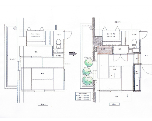 茶道は、道具を置く位置や足の運びが畳の目を目安にしています。通常、マンションの和室の場合畳のサイズがかなり小さいんですよね。そこで、和室6帖あったところを4畳半にし、炉を設置するために床を20cmほどあげました。炉を置くところ以外は床下収納ができるようなっています。余ったスペースには置き水屋が設置できるように物入を設けました。その他、畳の目の方向や釘の位置など流派によっても違いがあることなどこの物件を通してかなり勉強になりました。