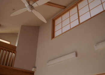 1階より2階をのぞむ。空気を流通させるファンを設置。