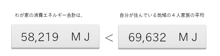 わが家は、地域の平均よりも少なくなっています。83%ほどです。これは、5年ほど前に行った断熱改修工事の成果が出ているのだと思います。ただ今までは、省エネを意識して生活しているわけでなく、生活スタイルを変えることで、さらに削減することも可能でしょう。いろいろなアイデアを実行し、目標地域別の平均の50%を目指していければと思っています。(光熱費の節約にもなりますしね)