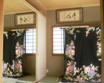 そのご自宅の一室を着付け室にリフォームしました。たくさんの和服があり、お客様が来られるたびに必要なものとそうでないものを整理されていたそうです。今回のリフォームでは、そのたくさんの衣装を収納するスペースと着付けスペースをすっきり分け、それをデザイン的に処理することでした。