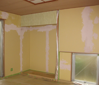 ※前日に養生をし、ボードのジョイントをパテ処理していきます。この作業がとても時間がかかるんですね。養生の仕方が悪いと仕上がりも悪くなります。