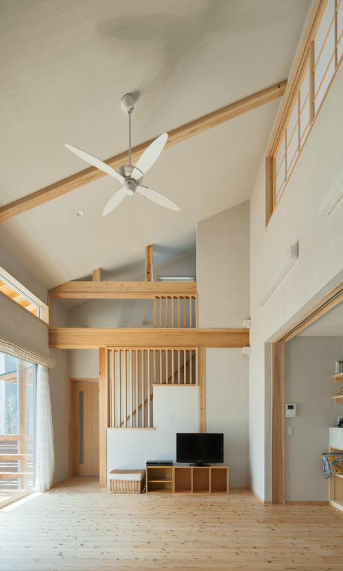 1階より2階をのぞむ。空気を流通させるファンを設置。