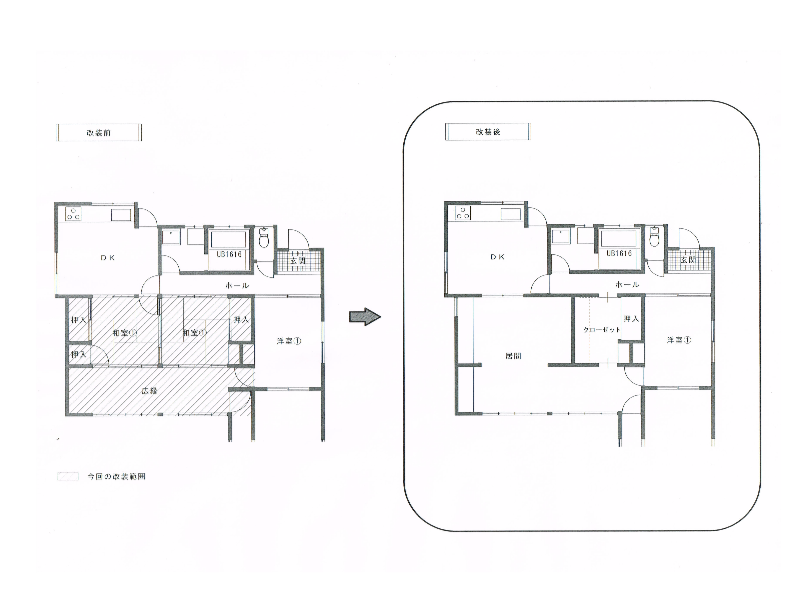 最初は、押し入れをクローゼットに改装したいという相談だったと記憶しています。何度かやりとりをしていくうちにせっかくお金をかけるなら、ということで、和室2間と縁側を含めたところで、プランを提案いたしました。上の図面の左側が改装前の間取りですが、和室2間、縁側の部分にタンスや洋服掛があって、南側の一番居心地のいい場所が、納戸のようになっていました。提案では、和室2間と縁側をリビングとちょっと大きめのクローゼットにしています。