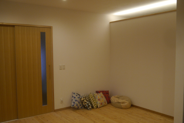 リビングとクロゼットの間仕切り。LEDの間接照明を設置することで、空間の広がりと明るさを確保しました。